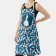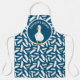 This white and navy blue illustrated apron is ready to be personalised with a name or other message. Create the perfect gift for fans of ducks. It features an all over pattern of white duck feathers against a navy blue background. At the centre is a blue circle featuring your message in white lettering and an illustration of a white duck.