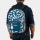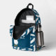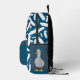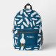 This personalised backpack's just ducky! It features a simple, realistic style illustration of a white duck with orange bill and feet set against a navy blue background with your own name or short message in white lettering on the front pocket. There are a couple of more ducks on the side panels and the rest of the bag has a pattern of white feathers against a blue background.