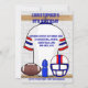 A unique sports birthday party invitation with a personalised American football grid iron jersey in white with red and blue stripes, hanging in a sports changing room with a football helmet, a water bottle and a football. The jersey can be fully personalised with the number and name (or age) of your choice to make a great party invitation for any football fan, grid iron player or football coach.