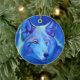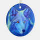 Unique, personalised wolf ornaments for special occasions such as Christmas, holidays and any special celebration... The acrylic painting design illustrated by Raphaela Wilson shows a portrait of a blue wolf with yellow eyes against a blue night sky. Make these custom ceramic ornaments the perfect personalised gift for wolf lovers by putting in your own text (such names and dates) on the backside. Category: template ornaments; wolf Christmas ornaments; and custom wolf gifts. Colours: blue, yellow and deep violet.