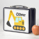 A personalised lunch box for your boy who loves yellow backhoe truck loader construction vehicles. You can change the text, font style, and colour.