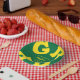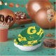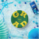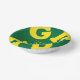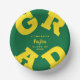 GRAD in bold yellow lettering curves around the edges of these green background graduation paper bowls personalised for your graduate - perfect for serving snacks, salads, desserts and more. MATCHING items and more pre-done colour combinations in our store.