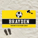 Personalised soccer themed beach towel design for kids and teens features a soccer ball customised with the player's uniform number, custom text for the player's first or last name, and modern text for the soccer club team name. Makes a unique favour gift for tournaments and pool parties with the team! Stylish and modern design features sporty varsity jersey lettering and simple horizontal stripes. The colour scheme of yellow, black and white can be modified to coordinate with your team colours.