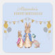 Personalize this Peter the rabbit 1st Birthday design with a child's name and the event.