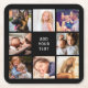 Personalized picture coaster featuring a black background that can be changed to any color, 8 photos of your choice, and a simple text template.