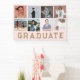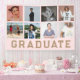 personalized graduation banner with 8 class graduate photos and the word graduate written in bold gold and white in the classic and traditional university typography on a pastel pink background for a bold party banner.