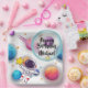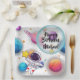 These personalized space-themed paper plates feature a cute astronaut floating among colorful planets, stars, and a magical galaxy background. Perfect for space birthday parties, astronaut themes, and outer space celebrations, these plates add a fun and vibrant touch to your party table.