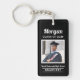 Modern personalized graduation keychain design features a square photo of the graduate framed in white with simple and classic custom first name, class year, and school name wording that can be personalized. Black background can be modified to coordinate with school or photo colors.