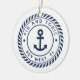Create a unique boat keepsake with this custom photo ornament featuring your boat name and ship's registry in navy blue lettering on a nautical rope badge with an anchor illustration in the center. Add a photo of your boat to the reverse side.