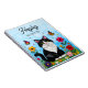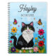 A sweet personalized notebook with a cute illustration of a black and white cat surrounded by flowers and butterflies in a paper quilling impasto style.