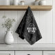 Modern black kitchen towel with white hand-drawn utensil icons and a bold “Your Name’s Kitchen” mark. Personalize the name for a stylish, chef-worthy accent or gift for home cooks.