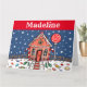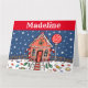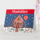 A colorful illustration of a festive gingerbread house. The outside of the house is decorated with two candy canes and has a large lollipop tree in the garden. The ground is covered in bright white icing sugar snow and strewn with sweets.