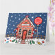 A colorful illustration of a festive gingerbread house. The outside of the house is decorated with two candy canes and has a large lollipop tree in the garden. The ground is covered in bright white icing sugar snow and strewn with sweets.