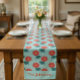Add a cheerful floral touch to your table with this personalized daisy pattern table runner, featuring bright red flowers on a soft aqua background. Perfect for everyday dining, spring gatherings, birthday parties, brunches, tea parties, bridal showers, or cottage-style décor.