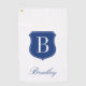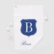 Personalized elegant name monogram logo blue and white golf towel. Monogrammed golfing gifts for men and women. Stylish script typography template for name and initial letter. Luxury Birthday gift ideas for golfer, husband, dad, father, friend, co worker, boss, colleague, coach, instructor, trainer, teacher, grandpa, retired person etc. Add your own surname or funny quote. Including hook to hang it up. Unique golf accessories for friends and family. Classy shield emblem design. Customizable colors.