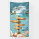 A fun tropical cruise scene featuring a large ship, sandy beach, playful wooden port signs, and a space to personalize your family name, ship name, port stops, and sailing dates—perfect for cruise lovers. This cruise door banner makes a great souvenir to remember your special trip.