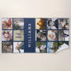 Display fifteen favorite photos or vacation memories on this uniquely printed personalized beach towel, featuring a gridded layout and square photos on a classic preppy navy blue background. Perfect for your Instagram snaps, towel features 15 photo templates with your family name or choice of personalization in modern script lettering.