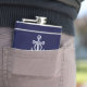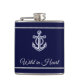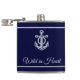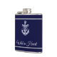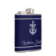 Personalized flask with name and title is a great gift for a boat owner or for yourself. The design features an anchor and it is in navy blue color for the background.