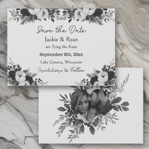 Pretty floral wedding cards with a black and white botanical pattern. Inside you can personalize the message and add your names.