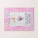 A jigsaw puzzle with a girls's unicorn birthday cake on a soft pink fuzzy background. Personalize it for the birthday girl!