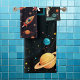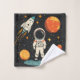 Fun bath towel set with a rocket ship and planets design, customizable with your name. Perfect for kids who love space!