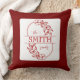 Elevate your home decor with this elegant and timeless personalized family name throw pillow. Featuring a chic deep red and white color palette, this design showcases a delicate botanical wreath surrounding your custom surname in a sophisticated serif font.