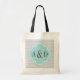Personalized 3 letter monogram teal blue and gray chevron stripe tote bag. Elegant quatrefoil design with grey zig zag lines. Custom name initials in classy chic typography font. Stylish wedding logo initialed with name of bride and groom. Cuet design for guest wedding favors. Customizable color for zigzag print background.