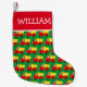 Personalized name kid's dump truck pattern Small Christmas Stocking. Cute xmas decorations for the winter Holiday season. Cute construction vehicle toy design for children. Make your own custom Christmas sock for son, grandson, nephew, new baby, newborn etc. Red dumptruck vector art print.