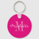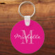 Neon pink and white name monogram round button keychain. Classy script typography and custom background color. Elegant key chain design for women and girls. Monogrammed with your own unique name initial letter. Cute wedding party favor or Birthday gift idea. Also nice for bridal shower, reunion, bachelorette, girls weekend etc.