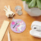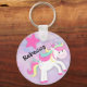 This very cute keychain (or keyring) can be easily personalized with your own name. The design features an adorable pink dancing unicorn, with rainbow colors in her hair and pink hooves. There is a large, pink star above her and a very pretty pastel pink background behind her.