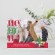Send festive cheer this holiday season with this fun and personalized family photo Christmas card! The top of the card features a cherished horizontal family photo, capturing a joyful winter moment. Overlaid on the snowy scene are bold, alternating red and green "HO HO HO" greetings. A vibrant red band at the bottom showcases a delightful illustration of the beloved Peanuts gang—Charlie Brown, Lucy, Linus, Sally, and Snoopy—gathered happily around a decorated Christmas tree. This band also includes customizable text for the family name, individual names, and the year, making it a truly personal and playful holiday greeting.