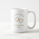 Add the couple's names and photo to this stylish golden 50th wedding anniversary mug. The golden tan simple, modern script is not real foil but faux gold. All the elegant typography is editable. Personalize this special photo keepsake coffee mug with the couples names and wedding anniversary date for a beautiful wedding anniversary gift. "Celebrating 50 Years" can be customized to any number for a 60th, 40th, 25th or any anniversary year. I created these hand drawn hearts for your keepsake 50th wedding anniversary gift. The two unique copper golden hearts created with impressions of leaves and buds, add a romantic botanical touch. This would be a great party favor for a golden 50th anniversary party. The table would look great with these commemorative cups and my golden heart napkins and coasters. Explore my collection for matching etched wine glasses, napkins and coasters for easy, yet stylish and unique custom party decorations.