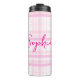 Cute pink plaid thermal tumbler with a custom name. Perfect for hot and cold drinks on the go with an aesthetic preppy style.
