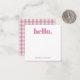 Personalized stationery enclosure notecard with a pink gingham pattern in notes of dark deep and vibrant rose pink bubble gum and white with the sentimental words "hello". Tuck it into a flower bouquet or meaningful gift. These minimal flower shop inspired enclosure cards bring a retro kitchen vibe to your most thoughtful moments.