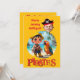 A perfect match for birthday fun! This cheerful design features your child as a cartoon pirate, standing on a beach with palm trees, a parrot, and treasure in sight. Insert your own photo and text.