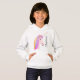 Personalized Rainbow Unicorn Flowers Girl's Hoodie for girls is designed with a glam style touch. The hooded sweatshirt is white and has a pretty white unicorn face on the center and it has rainbow hair with flowers on the top of head. Personalized with name in grey calligraphy script lettering vertical side.