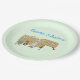 Camping paper plates with 5th wheel RV image and custom text. Include a name or names or camping saying on round or square paper plates. Pale green color with camper image in the center and names in blue at the top. This design is fun for all campers and will impress guests around the campfire.