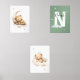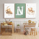 Bring calm, cozy charm to your nursery with this sage green teddy bear wall art set. Featuring three coordinating watercolor prints — a sleepy bear on the moon, a cuddly bear resting on a cloud, and a customizable name initial print — this design blends warm beige tones with soft green for a soothing, gender-neutral aesthetic.