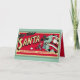 Personalize with your own Christmas greetings and family name! Be sure to write your message and name twice to complete the drop shadow effect. Design is from a retro Christmas advertisement. Text reads, "Hey Kids! Santa is here in our toy department daily from noon 'til 5." as a little boy and girl run to greet a waving Santa Claus. Inside reads "Merry Christmas from" with room for your family name below.