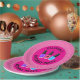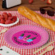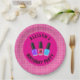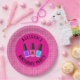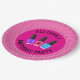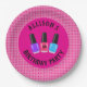 These custom party plates are perfect for a spa themed or slumber party. You can customize these plates with the birthday girl's name, age (optional), and party message. The default message is "Birthday Party" but you can change it to "Spa Party", "Slumber Party", "Spa Birthday Party," etc. These feminine party plates have hot pink polka dots set against a lighter pink background. In the foreground, there is a bold hot pink center that serves as a backdrop of an image of three nail polishes in purple, pink and blue.