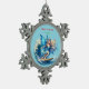 A silver, intricately designed snowflake ornament holds a circular insert featuring a vibrant illustration. The image depicts a blonde fairy with iridescent blue wings, dressed in a blue outfit, gracefully surfing on a large, foamy blue wave. Her long hair flows behind her as she balances on a light brown surfboard. The background is a soft blue, and the text "Merry Christmas" in red and the name "Vivian" in green are printed above the fairy. This unique ornament blends a magical, whimsical theme with a touch of surf culture, perfect for someone named Vivian who loves fairies, the ocean, or surfing during the holidays.