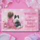 Girl's baby shower personalized Welcome to our baby shower banner. Sweet baby girl sitting next to her little black and white Mini Aussie puppy dog in a patch of pretty watercolor wildflowers.