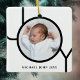 This modern Christmas Photo Ornament is decorated with the word JOY in black on a white background.