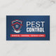 A clean and professional business card design for pest control technicians and small extermination businesses. The front features a bold red-and-blue shield graphic with a subtle insect motif, paired with strong typography: