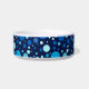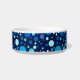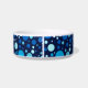 Pet bowl shown in white with a accent print in a blue dots pattern.