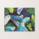 Original fine art painting of colourful budgerigar parrots by artist Carolyn McFann of Two Purring Cats Studio printed on a quality jigsaw puzzle for parrot lovers.