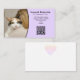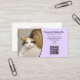 This eye catching business card design features your custom photo and QR code with all your details on the front over a pastel purple background. A heart of paws on the back. Fill in the template fields with your information, remove any text or edit using the design tool to select a font style, size, and colour you prefer. Replace the custom photo with yours and replace the QR code link with yours. The QR code link can lead customers to your website, photographs of your work or reviews. Placeholder photograph courtesy pixabay.com.