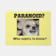 Sometimes you have to joke around a little to take care of the blues. Shake them off like this Chihuahua with the shaky Paranoid text does with Paranoid Paco. It's really not so bad...lock the doors, check the windows and hunker down under the sheets to watch some soap operas. You won't be said. Let the small dog inspire you to create your own text and font, if you want.