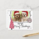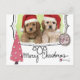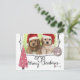 season greeting christmas pet photo cards. This Christmas photo card design is customizable with your own family name and photo! Or of course your dog. There's a christmas background, and the photo is separated from the design by a border. A fun doodle of christmas ornaments with reds and grays followed by "peace and Love" with a handwritten font feel. The rest of the text is customizable! Personalize with your own Christmas greeting or wishes, and your own family names. You can even add the date.
