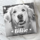 Photo fridge magnet featuring your custom pet photo with with the pet's name as a white text overlay flanked by two hearts.
